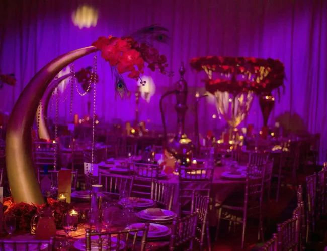 As a leading event management company, we specialise in creating visually stunning table centrepieces that transport your guests to the enchanting world of Bollywood. Our Tusk Table Centres feature intricate Bollywood-inspired designs and colours, evoking the spirit of India’s film industry.