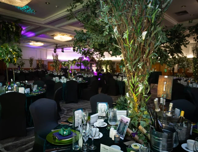 Each tall centrepiece features delicate twigs with flowers and foliage that evoke the enchanting ambiance of a fairy tale forest, creating an unforgettable and spellbinding atmosphere for all attendees.