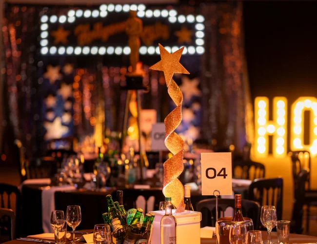 The Star Swirl Table Centre features a captivating arrangement of shimmering stars , perfect for a Hollywood Theme Event.